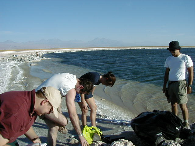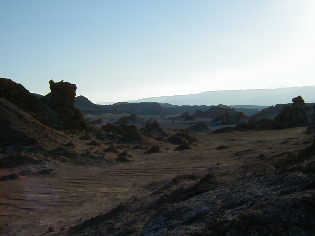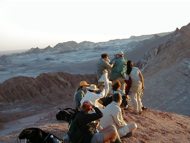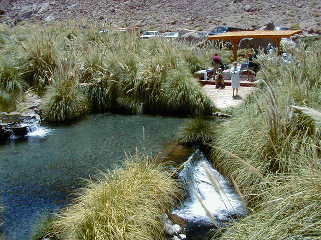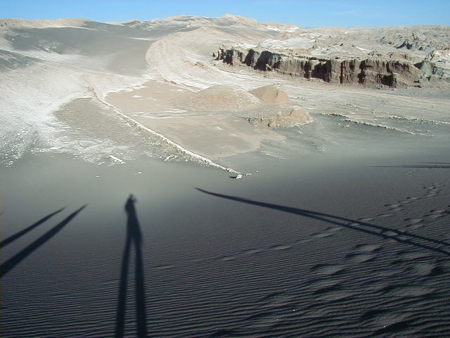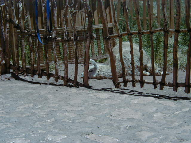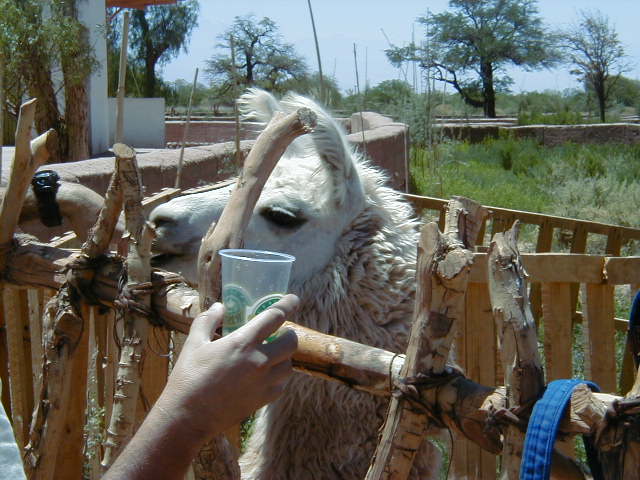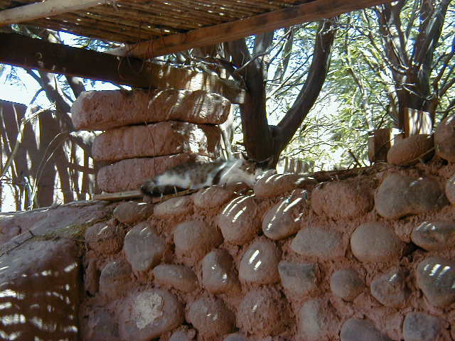 Day 6 - Sunday - Swimming Atacama Today's hike takes us along a deep river gorge. Destination: a remote natural hot spring. Along the way, our guide points out the cactus called "mother in law's pillow". Our reward at the end: a spread of wine, cheese and salmon, and a dip in the exclusive hot spring. They even provide us with bathrobes! Explora owns the highest hot spring pool, and the local villagers have to bathe further downstream. :( To be fair, Explora has invested a lot of money to make the pools accessible, clean and safe for everyone. As a change of pace, we decide to do lunch in downtown Atacama. The city borders on the third world, but the town radiates a certain energy from the swarms of young adventure seekers that crowd the streets. We eat at "Adobe", where the atmosphere is shamanistic and relaxed. After lunch, it is too hot to do anything, so it is time for a siesta for all: cat, llama, and me. The day ends with a hike to "Valle de La Luna", the Valley of the Moon. The landscape is surreal - fist sized clumps of salt, sweeping sand dunes, rhinocerousesque rock formations, and scenes that look cut from a sci-fi movie. This is when *I* get altitude sickness. While everyone else
