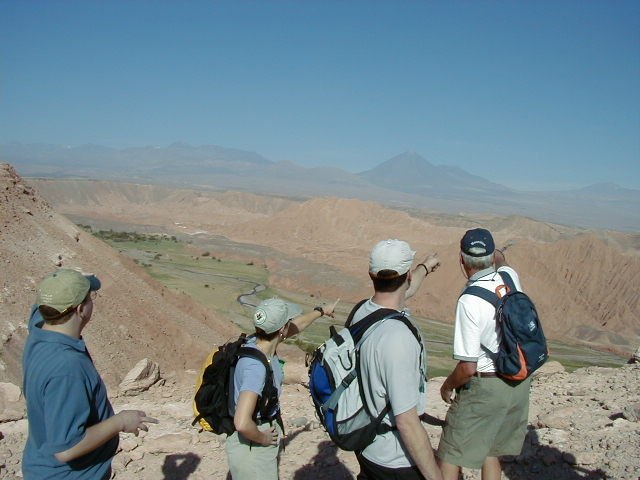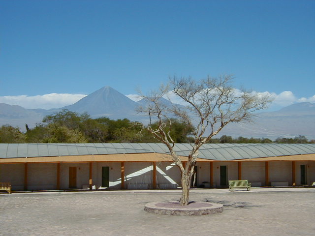 Day 4 - Friday - Hiking Atacama Friday morning we fly from Santiago to Calama, in northern Chile. From Calama we are driven an hour and a half through the desert to San Pedro de Atacama. The hotel Explora is world famous for its stunning locations and interactive vacation experience. They certainly have a good view of the local volcano. Despite being in the middle of one of the driest deserts in the world, the shower heads are the size of frisbees, they serve three gourmet meals a day, and have four luxurious swimming pools. The courtyard includes a real live llama, which, I was later informed by the hotel staff, is just for show. Explora is "interactive". Each afternoon, guests talk with hotel guides and plan morning and afternoon expeditions for the following day. After we had arrived and unpacked, we caught up with the afternoon
