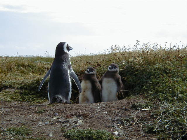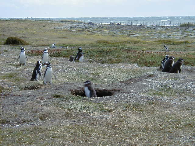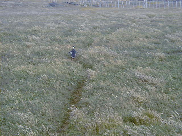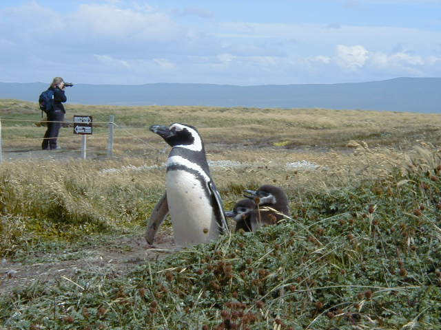 Day 9 - Wednesday - Penguins of Punta Arenas Punta Arenas is southern. *Really* southern. It is the southernmost city in the world. The sun set around 11pm while we were there. We take a stroll through the city's amazing cemetery, where bodies are stored in cubby-holes in vast concrete walls. Each cubby has pictures and memorabilia of the deceased. It is an eerie honeycombed necropolis. I want penguins! We find a tour van to take us to the local penguin rookery. Sure enough, there be penguins there. Magellanic penguins to be exact. The babies are just losing their down, and the parents look like they are preaching lessons. I think some of them enjoy the attention. This little one wanted to cross the road, but fled in terror along the inland penguin path. On the ride home, we catch a glimpse of the elusive Patagonian gray