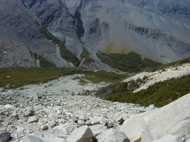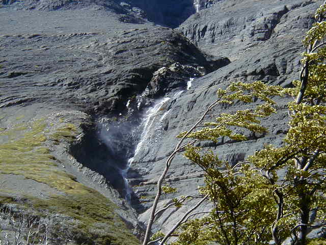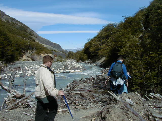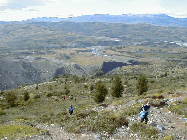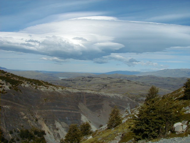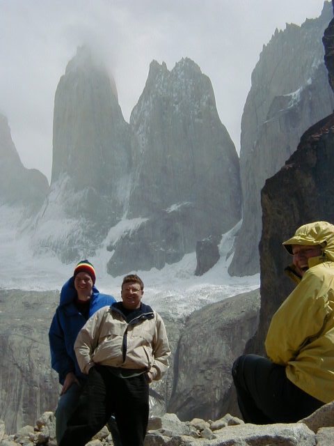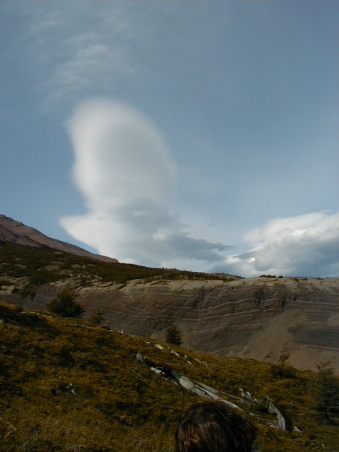 Day 11 - Friday - Climbing Paine del Torres To the Torres! We're going to climb up to the base of those pointy bits in this picture. A monstrous Ford van drives us to the foothills, across a very narrow bridge built by British settlers in the 1800s. We all offer to get out and push. The guides hand out walking poles and we're off! Up, up the rolling foothills, up, up through the blustery forest, up, up past the churning river, up, up the rocky glacier slide, until we reach the summit. *phew* It's been four hours of uphill hiking, and we are ready for lunch. I've never tasted better sandwiches. There are so many microclimates in Patagonia that we experience sunshine, rain and snow at various points during the hike. On the way back down, I notice how the wind is blowing water right off the mountain. The wind is so strong, it shapes the clouds into things like UFOs and Marge Simpson.